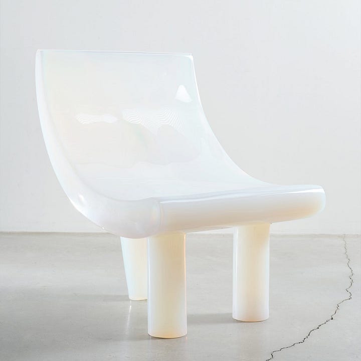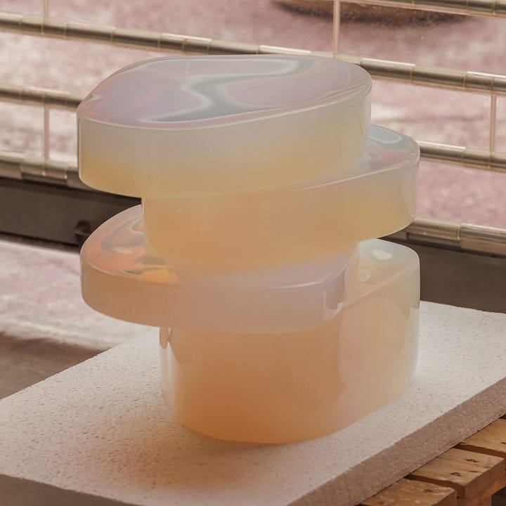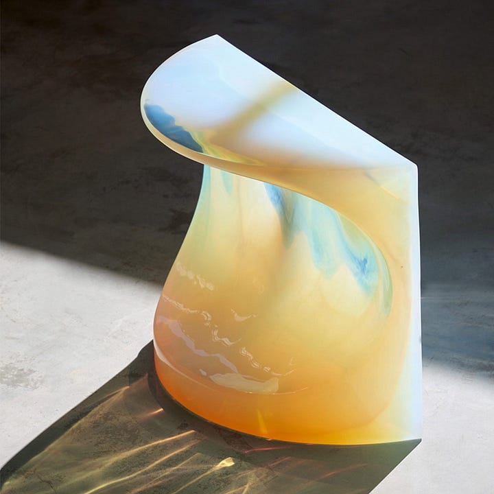 A big draw for designers to resin is how it can create infinite gradations of transparency, colour and luminosity. Design studio Objects of Common Interest, for example, acquired a secret recipe for creating resin with a unique iridescent finish and used it to create the Poikilos collection of chairs and objects with a pearlescent milky transparency.