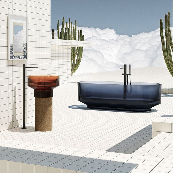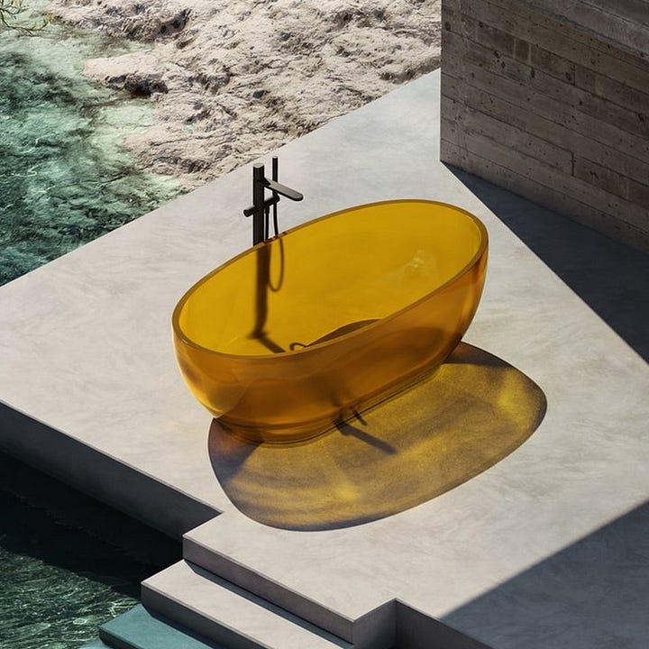 Big brands are in on the act too. Bathroom specialist Antonio Lupi formulated a highly resistant, high gloss coloured resin christened Cristalmood, which they used to create translucent bathtubs that make you feel as if you were soaking in a Venetian wine glass.
