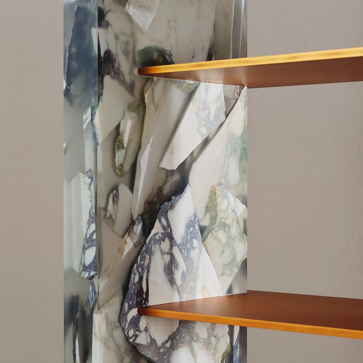 Resin also offers designers the freedom to experiment with different techniques. Multi-disciplinary designer and architect Payam Askari takes offcuts of marble and sets them within slabs of resin, which is then used to create the structural support of the MT Shelving System. The material resembles terrazzo but with an intriguing 3D layering effect, with shards of marble floating within the blocks of resin.