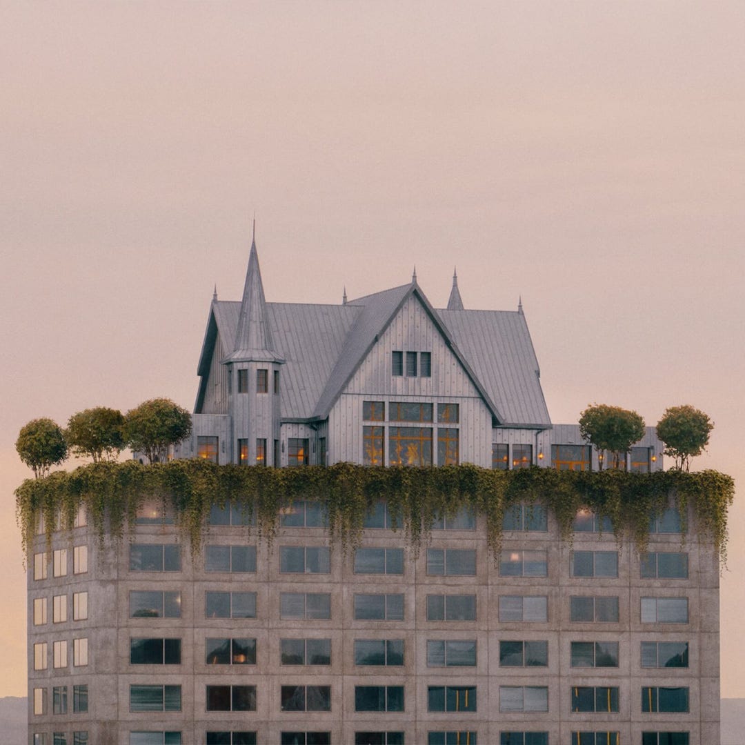 AI-generated designs are inherently imitative and their outputs tend to be rather bland. The best way to outfox AI is therefore to unleash unbridled creativity, creating designs that capture our emotions and imagination. A good starting point is for designers to elaborate the inspirations behind their works. Very often it is the way these stories resonate with our experiences and emotions that make the products feel precious to us. The master of storytelling through design is Philippe Starck. One of his recent architectural projects is Maison Heler, a hotel in Metz featuring a nondescript block with a traditional style mansion perched improbably on top of it. He conceived this remarkable design by creating a fictional character, Manfred Heler, and designed every element of the building around his imaginary life. There is the charming backstory of how Manfred, an eccentric inventor, was daydreaming in his armchair when his mansion was extruded up to the sky, “as if a cookie-cutter had arrived from below, cut off the Earth’s cap and mounted it vertically.” Whimsical objects such as a crystal hammer and inverted rocking chairs add to the surreal vibe, whilst old coins and quotes scattered around the building reminds us of its imaginary owner. Starck even wrote a novel, “The Meticulous Life of Manfred Heler”, to document his hero’s adventures. This level of immersive design creates a connection with users far deeper than any AI-generated content can achieve.